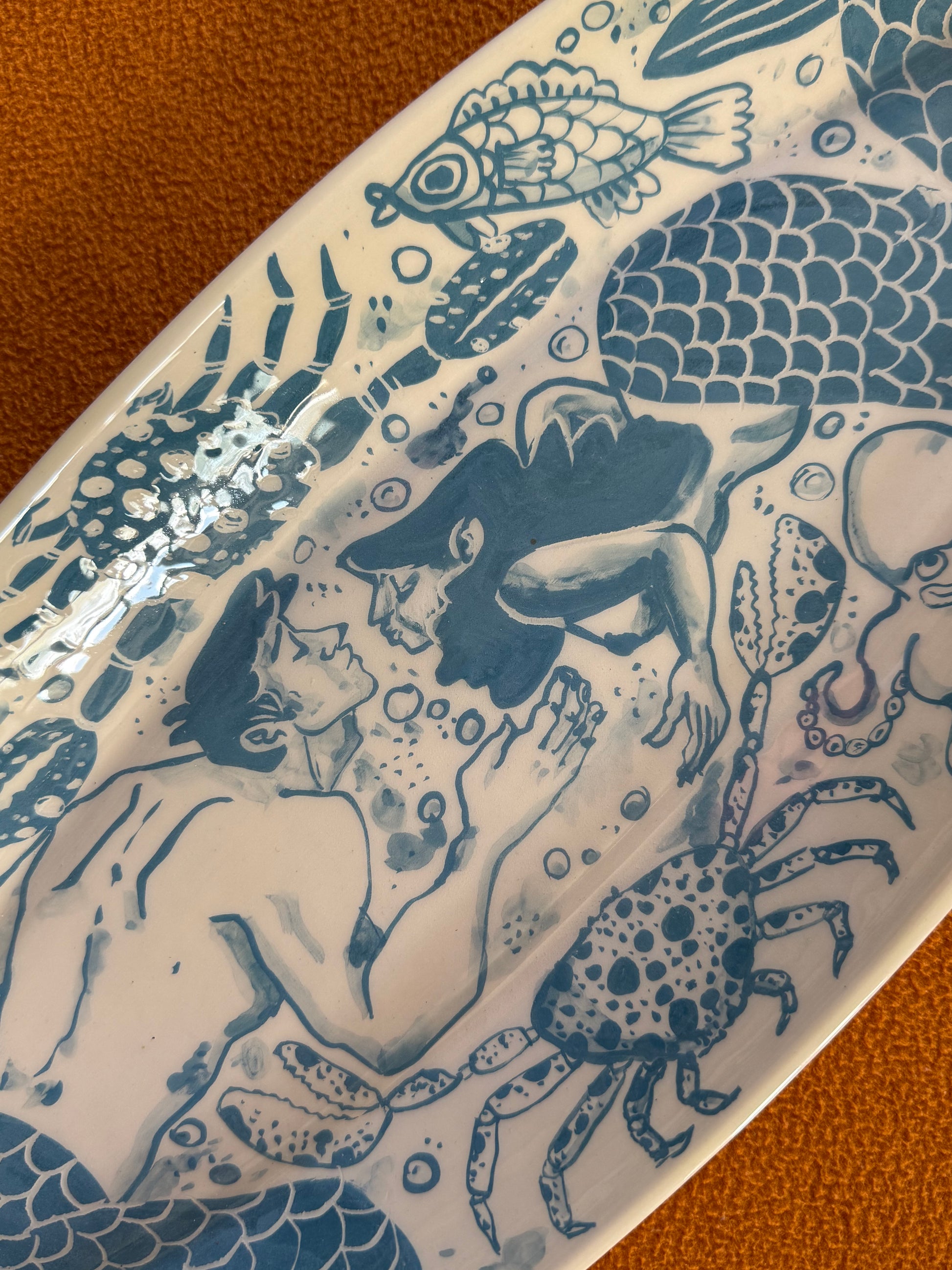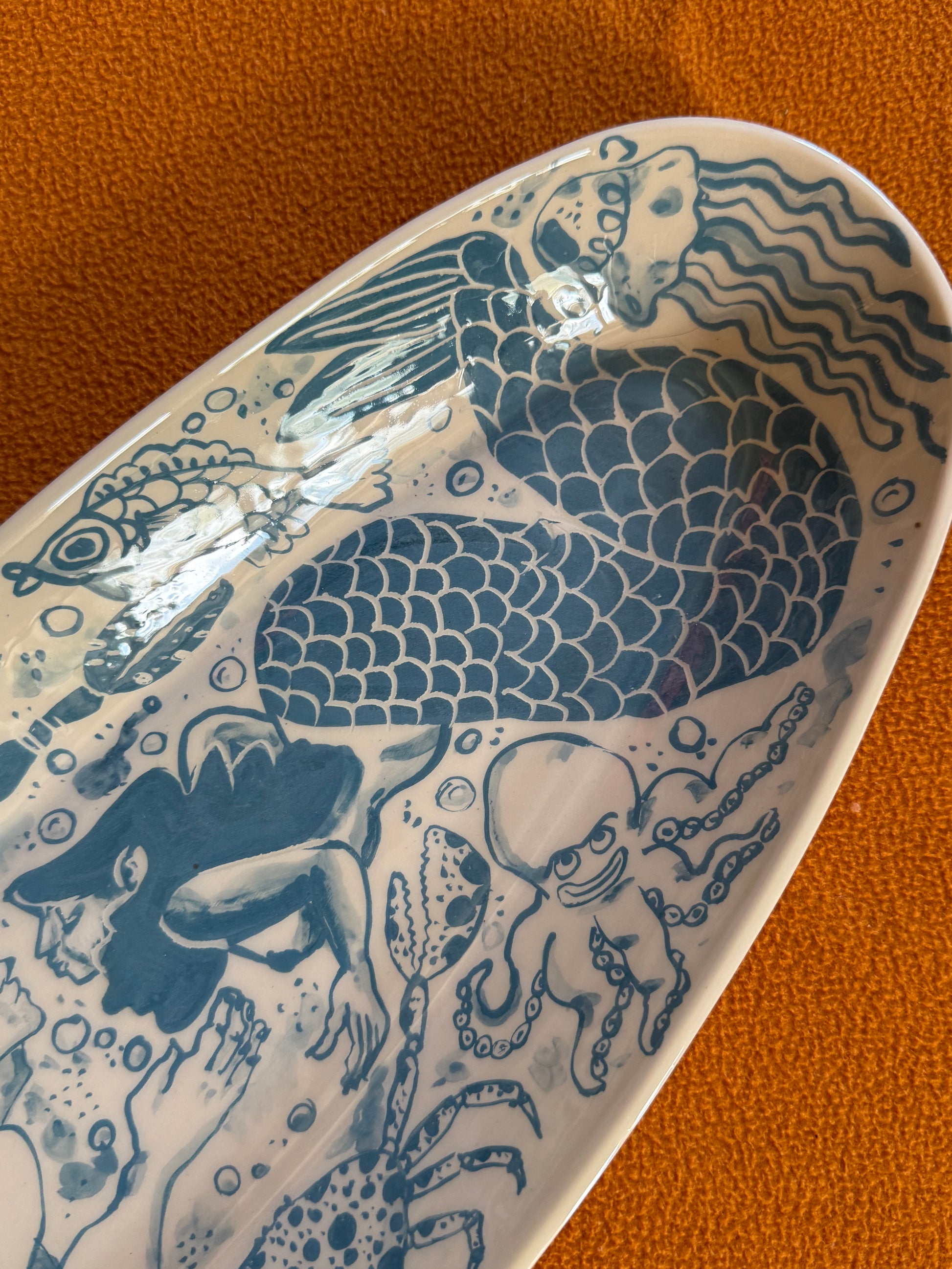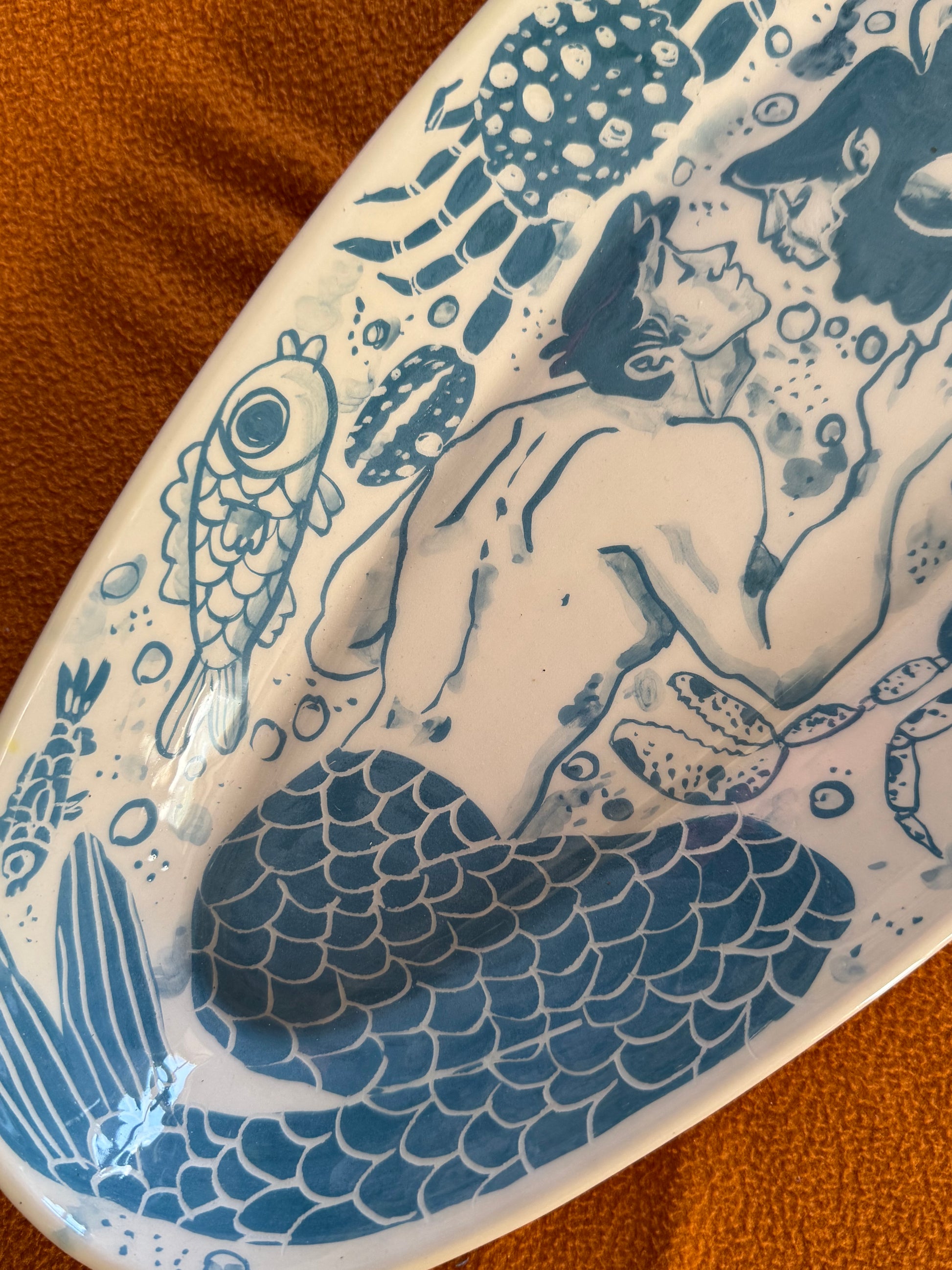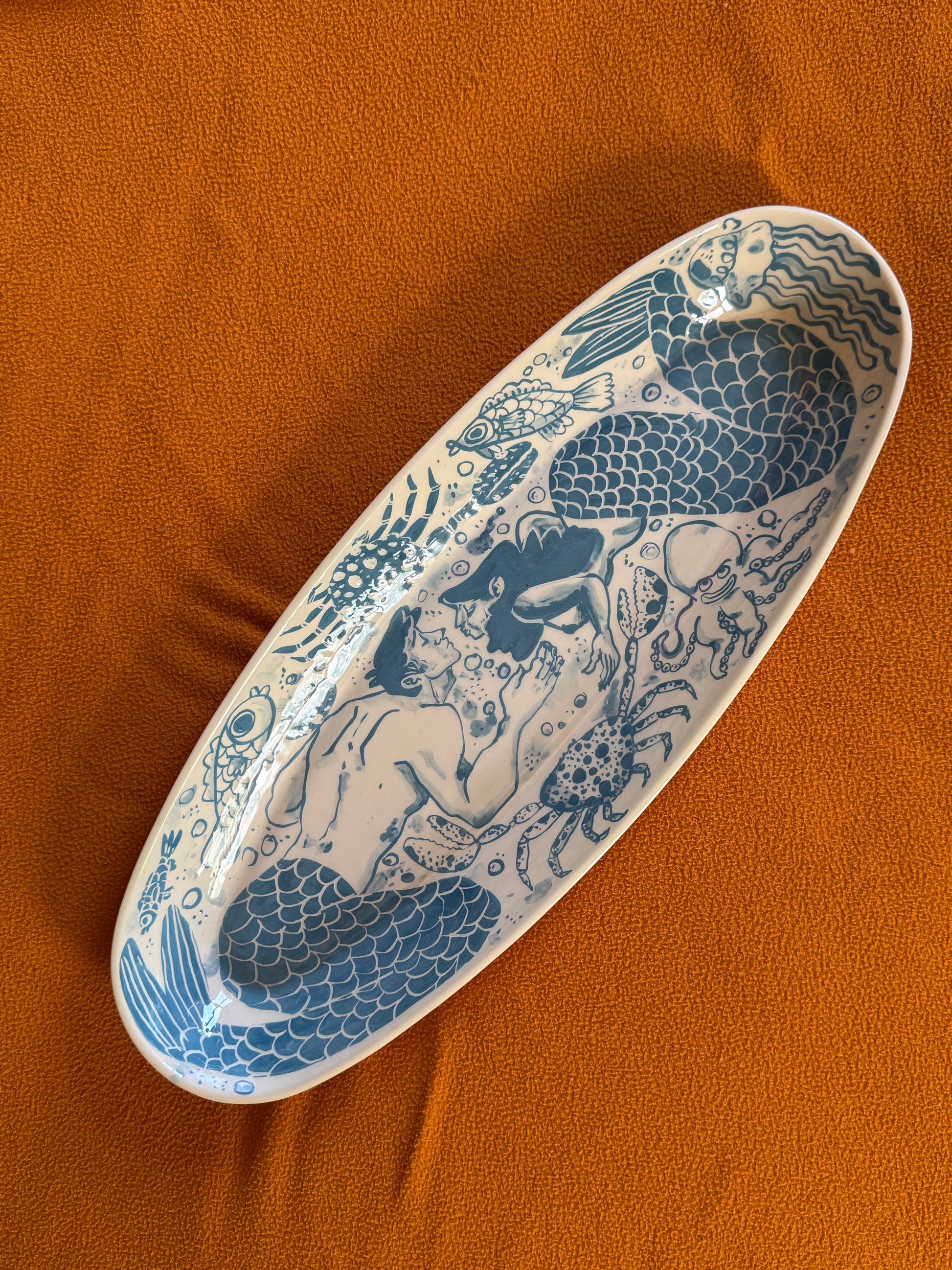 πβ¨ Just beneath the waves, magic stirsβ¦ On this enchanting oval-shaped ceramic serving tray, a mermaid and a merman reach toward each other for their very first kiss, surrounded by a joyful flurry of sea creatures β starfish β, crabs π¦, fish π , and swirling seaweed π. Itβs a love story served up in ceramic!