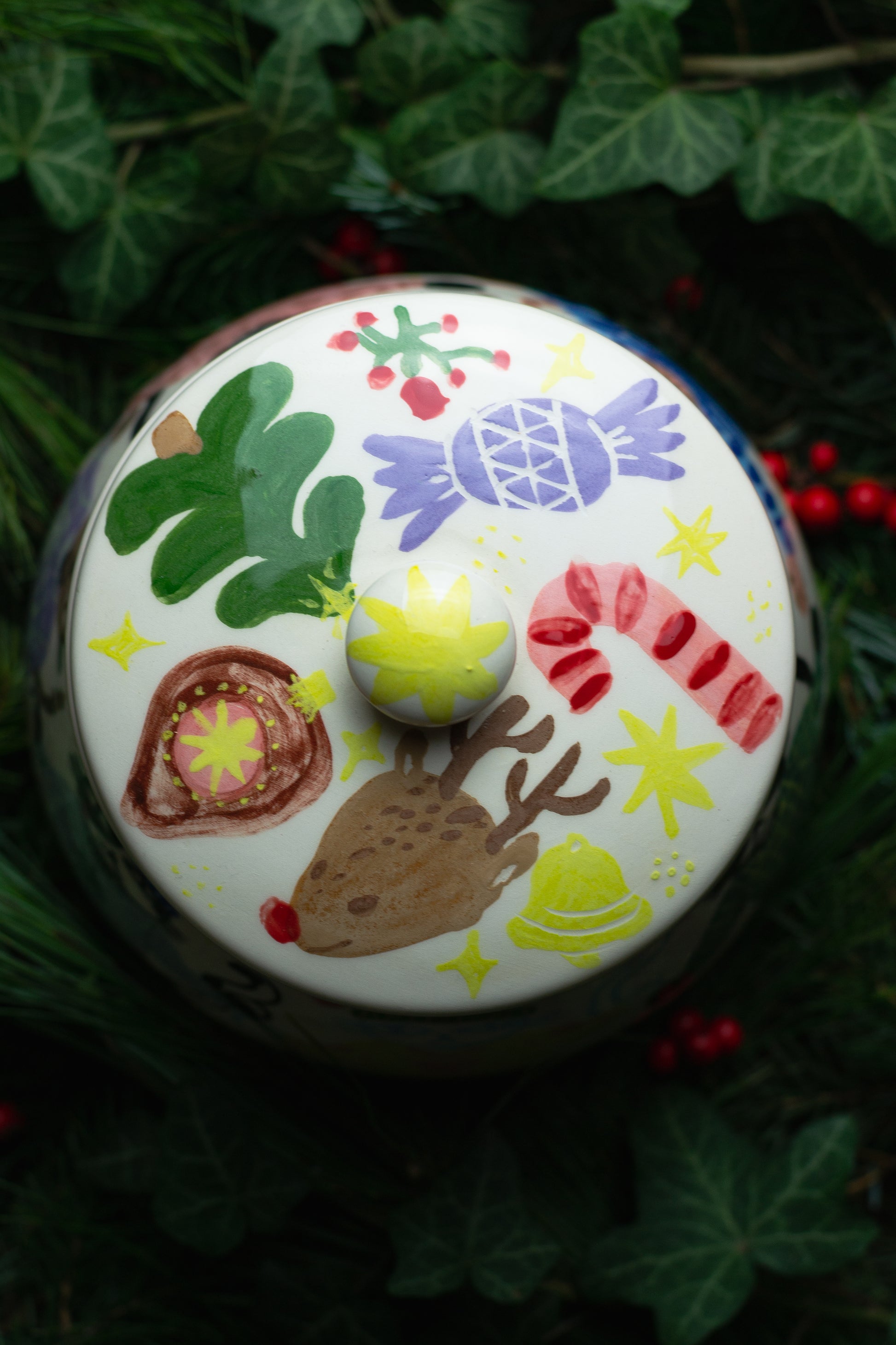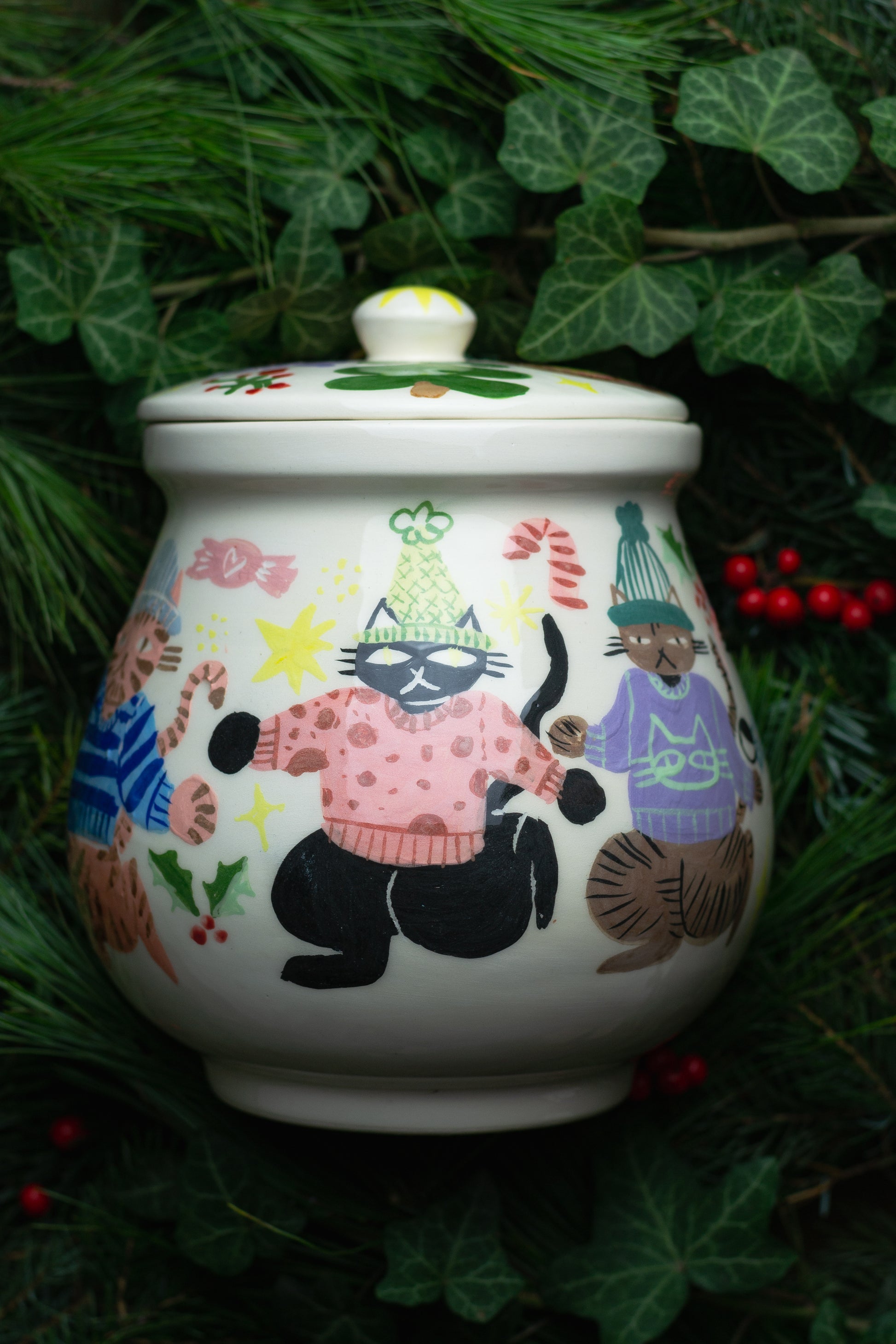 The showstopper of the entire collection: a huge 2-liter festive cookie jar, wrapped in a parade of knitted jumper cats dancing around its surface.